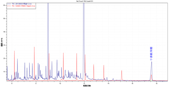 樣品TIC圖(藍色)與多溴聯苯醚混標TIC圖(紅色)