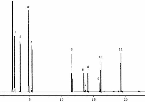 1. 苯 2.甲苯 3.間二甲苯 4.鄰二甲苯 5.正十四烷 6.甲苯二異氰酸酯(I)7. 甲苯二異氰酸酯(II)9.己二異氰酸酯 10.異佛爾酮二異氰酸酯(I)11. 異佛爾酮二異氰酸酯(II) 12.二苯甲烷二異氰酸酯