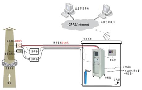 采樣探頭安裝于企業廢氣排口,排口被測廢氣被負壓抽泵抽取進入采樣探頭探桿(不加熱),經過陶瓷濾芯進入伴熱管線(伴熱溫度可設置),樣氣在伴熱管中繼續傳輸至預處理系統,在預處理系統經過二級過濾和分流后按照一定流量送至在線氣相色譜儀(GC-FID)。在線氣相色譜儀控制內置自動取樣平面十通閥和定量環系統取1mL的被測樣氣,借助載氣送入色譜柱分離和FID做定性、定量分析。分析結果通過工控機保存,并和排氣筒監測排放參數一起通過數采儀送至環保監控平臺。