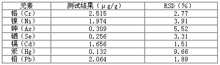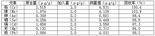 Hg標(biāo)液單獨(dú)為一組。Cr 、Ni 、As 、Se 、Cd 和Pb 標(biāo)液用各元素10μg/mL的標(biāo)液稀釋至所需濃度。配制Hg標(biāo)液時加入0.1mL 20 μg/mL金標(biāo)準(zhǔn)溶液。分析結(jié)果(表2)顯示,這7種元素的線性方程的相關(guān)系數(shù)為0.9996~1.000 ,檢出限為0.008~0.165ng/mL。