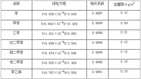 7種苯系物在進樣量1-320ng范圍內(nèi)線性相關(guān)系數(shù)為0.9981-0.9999,線性關(guān)系良好。以響應(yīng)信號為基線噪聲10倍時對應(yīng)的進樣濃度作為定量限,確定物質(zhì)的定量限均小于0.21μg/m3。