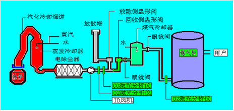 如圖2可見,在回收側盅形閥/分散側盅形閥前布設煙氣在線分析儀,只有當通過CO在線監測系統測得轉爐煤氣中的CO濃度在30%以上時,才打開氣體切換站的回收側盅形閥進入煤氣柜儲存,否則通過分散側盅形閥通過放散塔點火燃燒。在煤氣柜前布設煙氣在線分析儀,只有在線監測系統測分析保證煤氣柜內O2含量不會超標(控制在1%以下)才允許焦煤煤氣進入煤氣柜,否則啟動停止回收,以保證系統的穩定性和安全性。