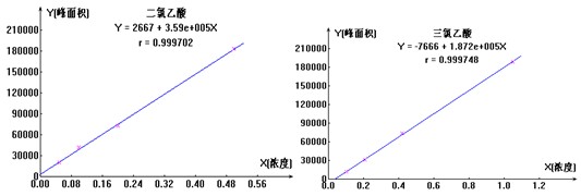 移取一定量的二氯乙酸標液(1000μg/ml)、三氯乙酸標液(1000μg/ml),配置成的二氯乙酸(濃度為10μg/ml)、三氯乙酸(濃度為5.0μg/ml)混合儲備液,再分別移取0ml1.0ml2.0ml5.0ml10.0ml10μg/ml的二氯乙酸、三氯乙酸混合儲備液至100ml玻璃容量瓶,并加超純水定容,配制成二氯乙酸、三氯乙酸系列混合標準溶液,如下圖4 為二氯乙酸、三氯乙酸離子標準曲線圖。