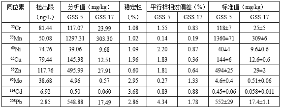 在優(yōu)化的儀器工作參數(shù)下,建立標(biāo)準(zhǔn)溶液工作曲線(線性相關(guān)系數(shù)達(dá)0.999以上),再分別取待測溶液上清液上機測試。其中:取兩個平行樣測試結(jié)果的平均值為分析值;對樣品空白溶液平行測定11次,計算11次測試結(jié)果的SD,以3×SD/kk為標(biāo)準(zhǔn)溶液工作曲線的斜率)對應(yīng)的值為方法檢出限。取一份GSS-17樣品溶液進(jìn)行穩(wěn)定性考查,即間隔2min采集一個數(shù)據(jù),連續(xù)采集7組數(shù)據(jù),計算7組數(shù)據(jù)的RSD,作為穩(wěn)定性指標(biāo)。所得實驗數(shù)據(jù)見表4