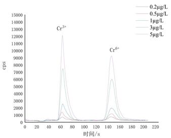依次進樣測試0.2 μg/L、0.5 μg/L、1 μg/L、3 μg/L、5 μg/L Cr3+和Cr6+混合標準溶液,分離度R>1.5,完全分離。