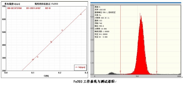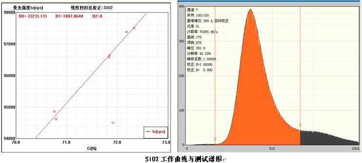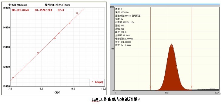 各個(gè)元素的工作曲線與測(cè)試譜圖,其中B0為曲線節(jié)距;B1:為曲線斜率;在測(cè)試譜圖中有元素的測(cè)試信息:計(jì)數(shù)率,采樣時(shí)間,分辨率等。