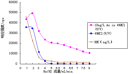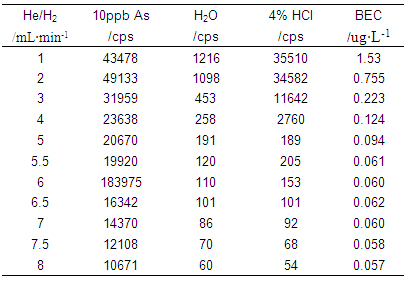 儀器首先在標準模式下進行參數優化(利用10μg·L-1的Li、Co、In、U、Ce調諧液對儀器工作參數進行調節,使儀器靈敏度高,同時氧化物及雙電荷產率小于3%);再開啟He/H2碰撞反應氣,逐步增大He/H2流量,測試超純水、4%HCl及10μg·L-1 As(4%HCl介質)在75amu處的響應信號,計算其背景等效濃度(詳細數據見表1及圖1);并利用As標液進一步優化He/H2流量,得到儀器工作參數如表2所示。