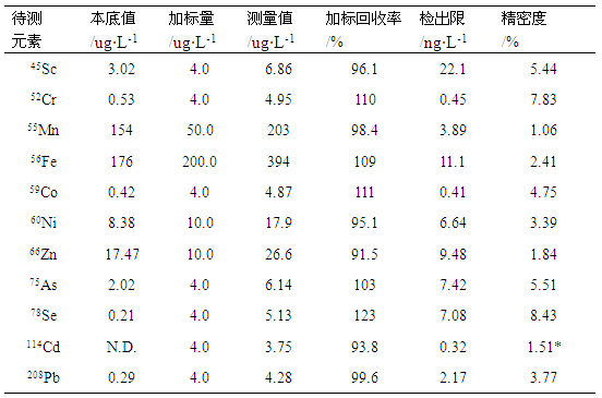 在儀器優化工作參數條件下,對樣品溶液及加標樣液進行測試,計算其加標回收率;對樣品空白溶液平行測定7次,以三倍空白信號標準偏差/靈敏度對應的濃度為檢出限;同時對樣品溶液平行測定11次(間隔2min),計算其相對標準偏差,考察精密度,數據見表4。各元素檢出限在0.41-22.07ng/L之間,加標回收率在93.82%-123.10%之間,精密度在1.06%-8.43%之間。