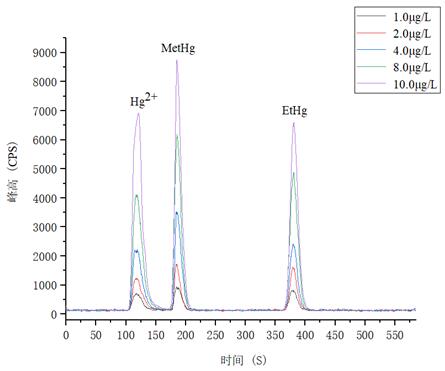 1.0μg/L、2.0.μg/L、4.0μg/L、8.0μg/L、10.0μg/L 汞形態混合標準溶液分離色圖譜如圖3所示,其中無機汞(Hg2+)、甲基汞(MetHg)、乙基汞(EtHg)相對保留時間分別為118s、185s、379s,從譜圖疊加圖上可以看出,三種汞形態出峰時間穩定,且分離度較好。